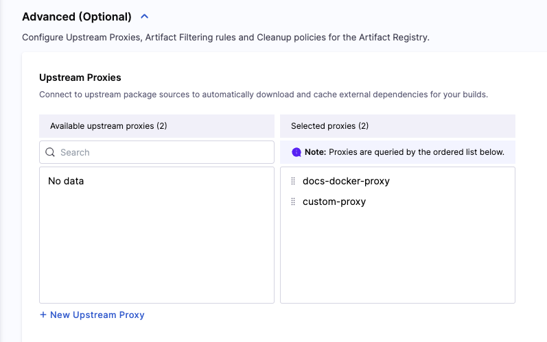 5. Under Selected proxies, you will see an ordered list of selected proxies for this registry. When the registry receives a request, the proxies will be queried in order from top to bottom.