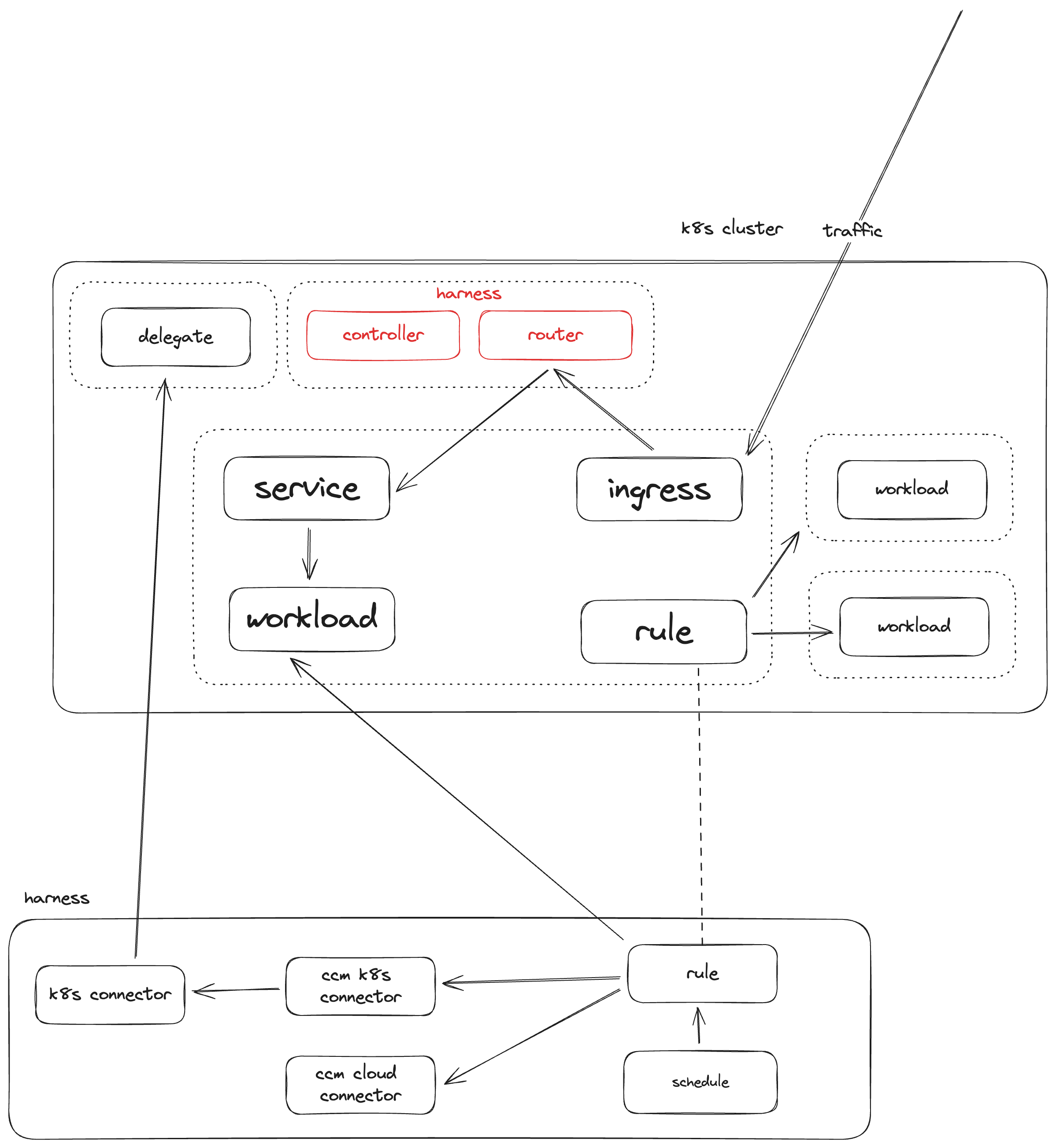 Harness can monitor the traffic of an ingress rule and bring pods up and down based off the traffic seen. It does this by modifying the ingress rule to send all traffic to the auto stopping router, and then the router sends the traffic to the service that backed the ingress resource.