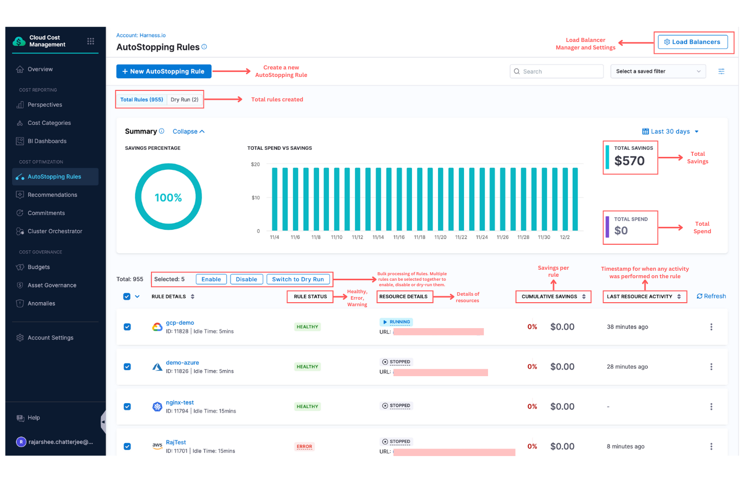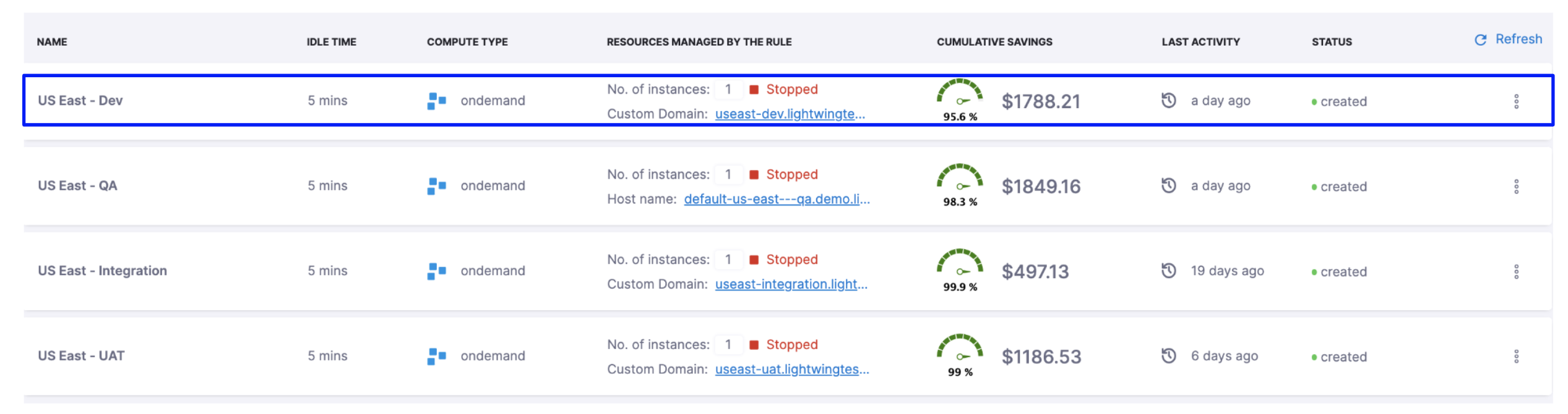 AutoStopping dashboard allows you to view a summary of all the AutoStopping rules you have created in a simple and intuitive interface. The following are the key features of the AutoStopping Rules dashboard: