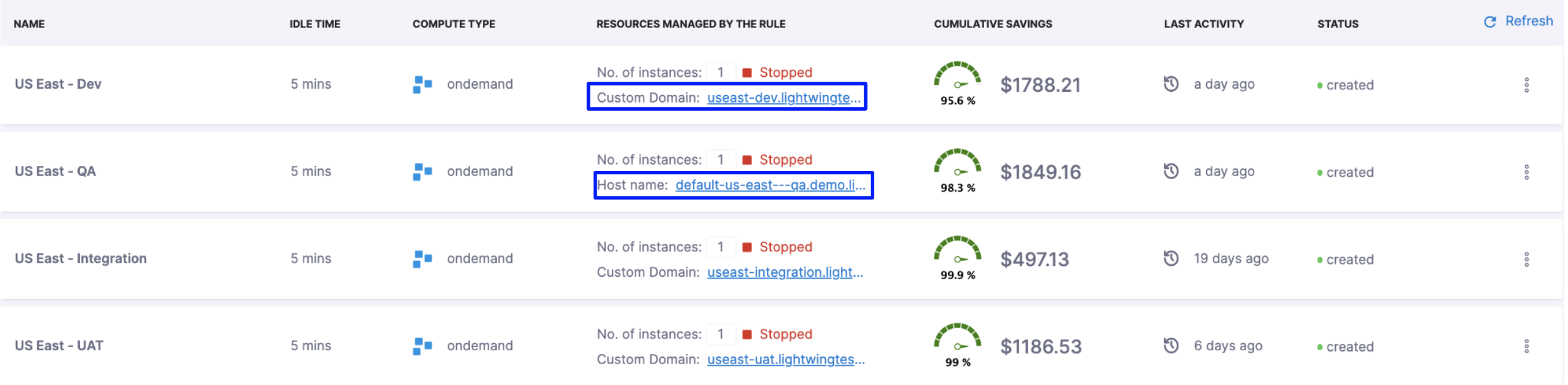 1. In AutoStopping Rules, in Summary of Rules, click on the Custom Domain or Hostname of the selected instance.