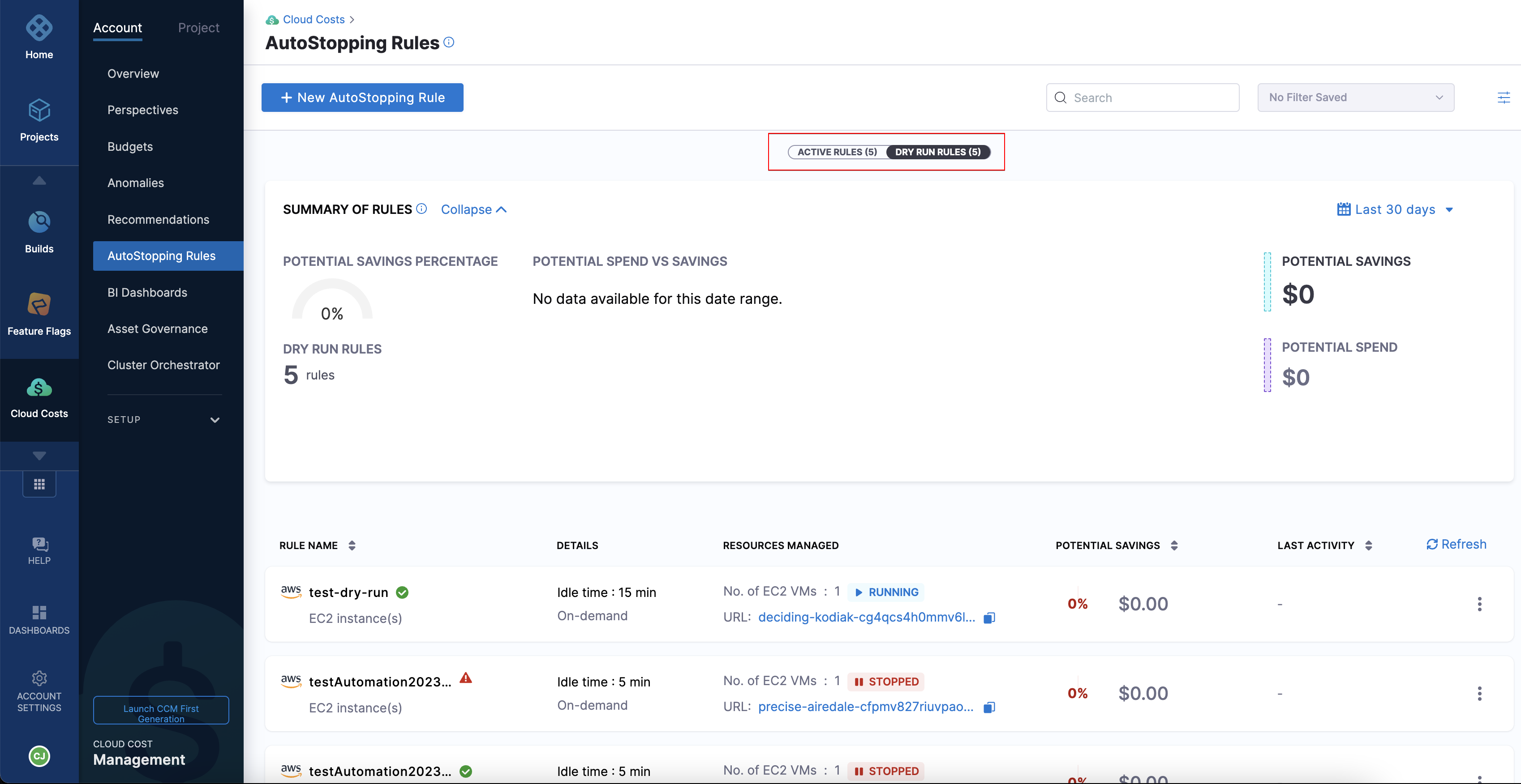 After creating the AutoStopping rule in the dry-run mode, you can view the rules on the summary page.