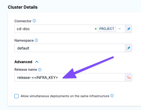 The Release name setting in the stage Infrastructure is used as the Helm Release Name to identify and track the deployment per namespace: