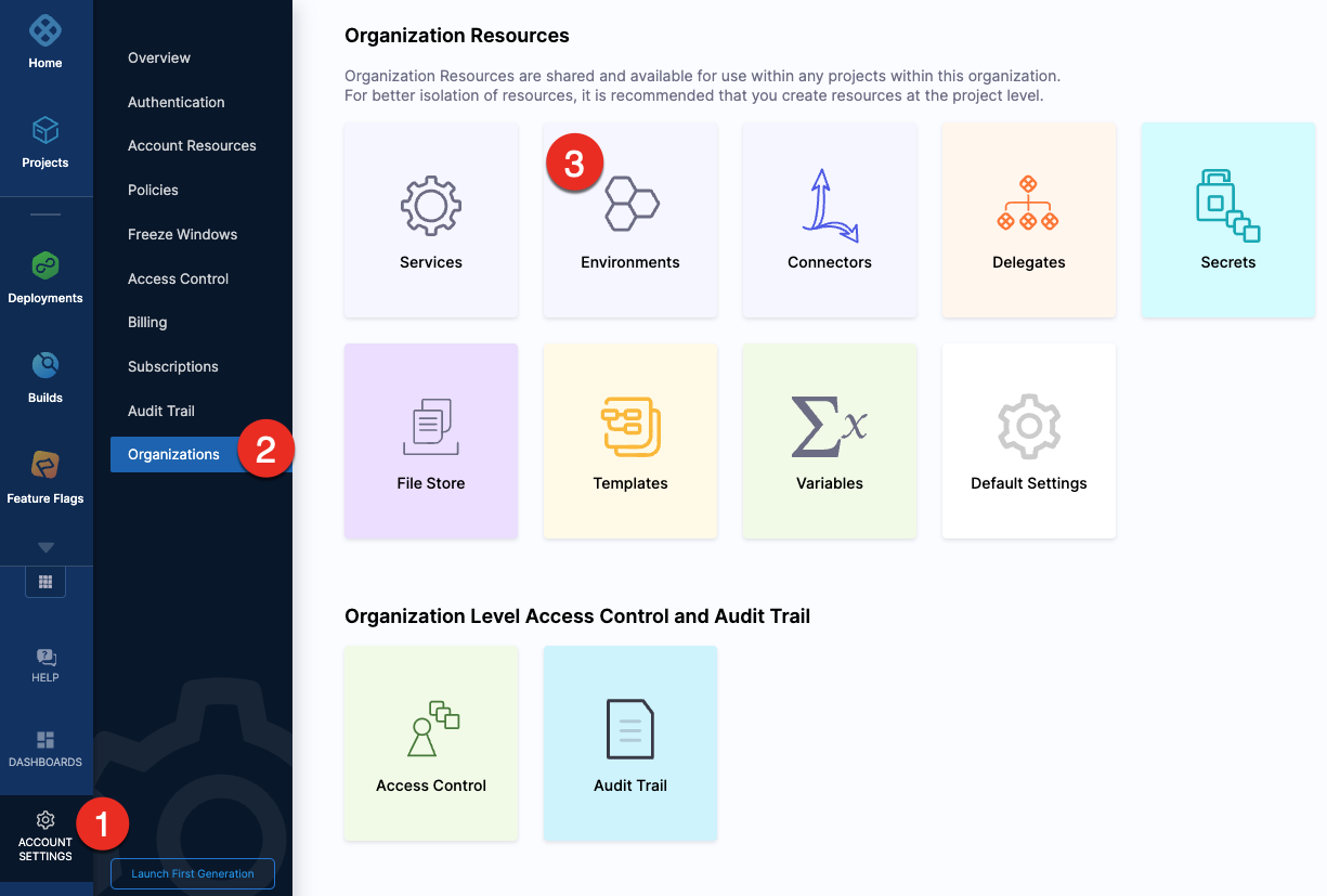 Environments represent your deployment targets (QA, Prod, etc). Each environment contains one or more Infrastructure Definitions that list your target clusters, hosts, namespaces, etc.