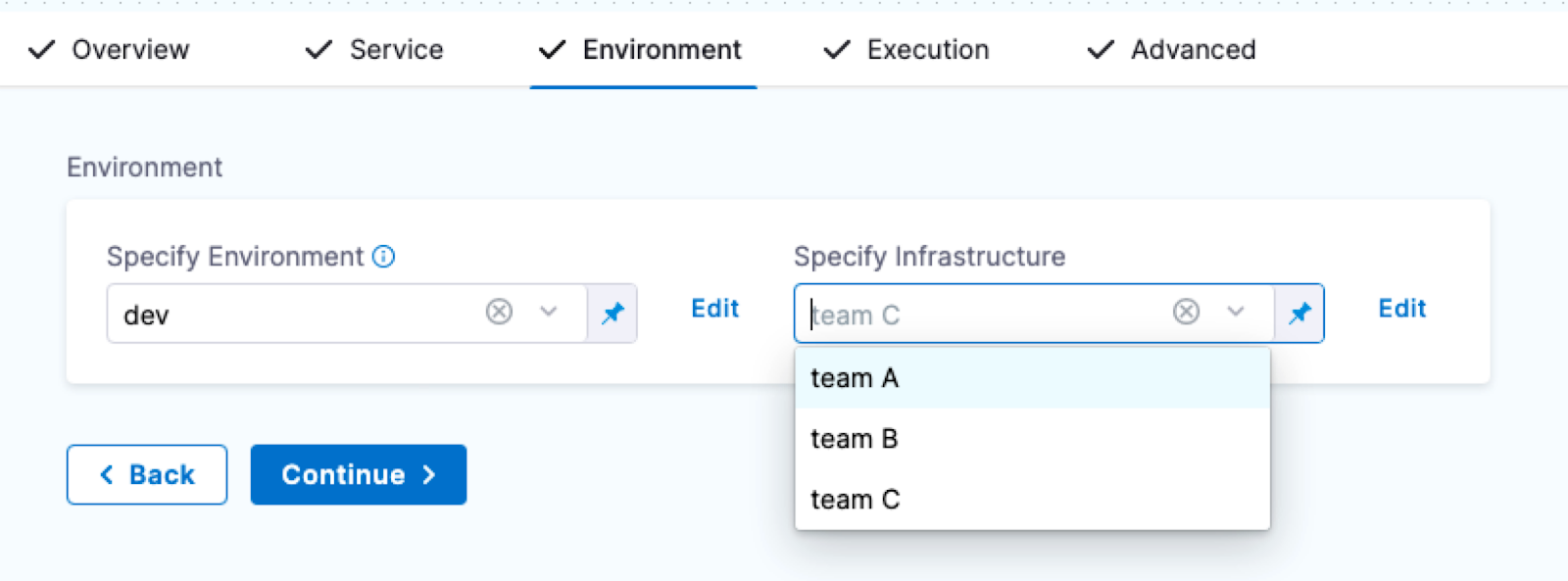 When you select an environment in a stage, you can select the Infrastructure Definition to use for that stage.