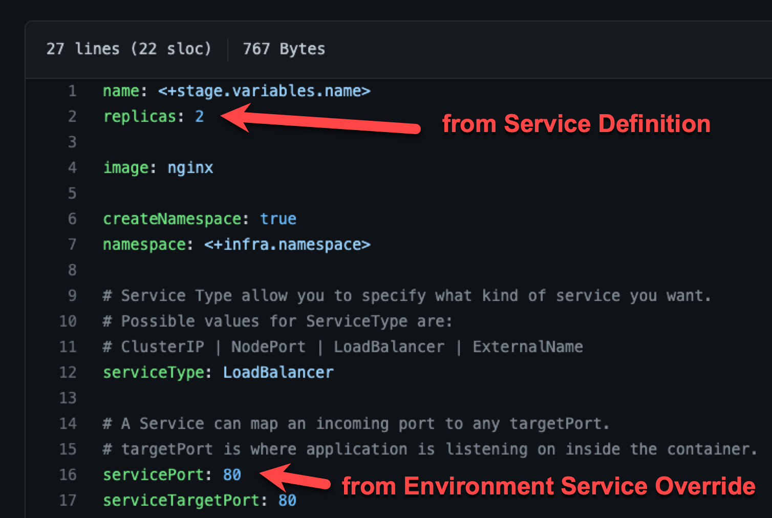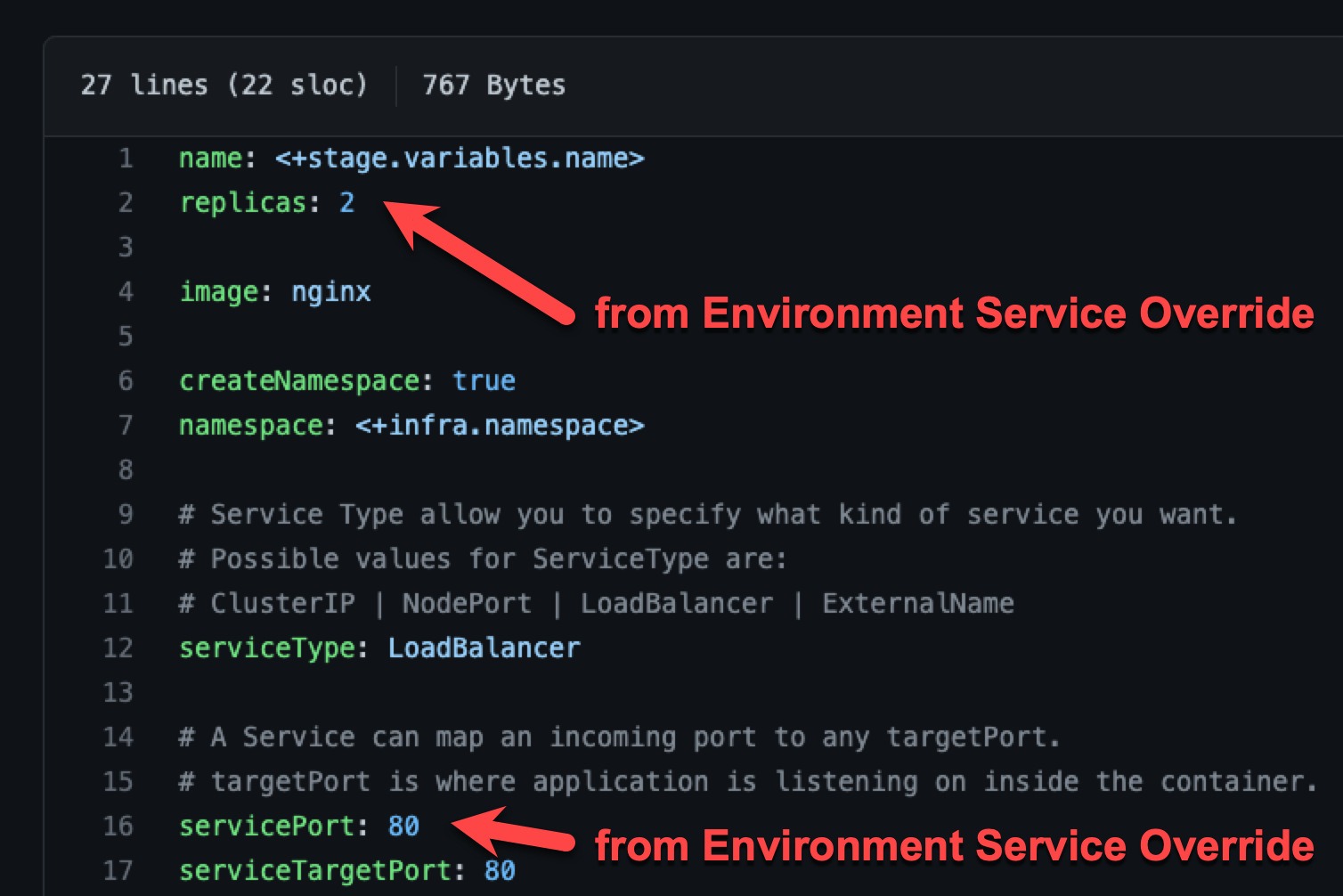 An environment's Service Overrides values YAML has the name:value pairs replicas: 2 and servicePort: 80