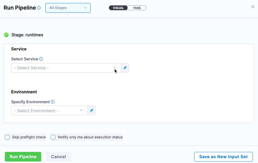 • In a pipeline's Advanced Options, in Stage Execution Settings, you can set up selective stage executions. This allows you to select which stages to deploy at runtime.