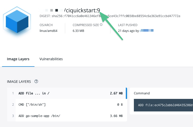 When you run a pipeline, you can observe the step logs on the build details page. If the Build and Push step succeeds, you can find the uploaded image in your Docker repo.