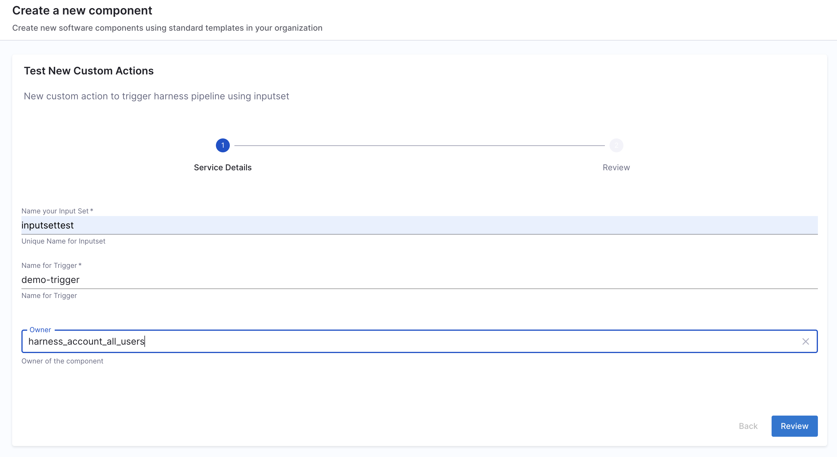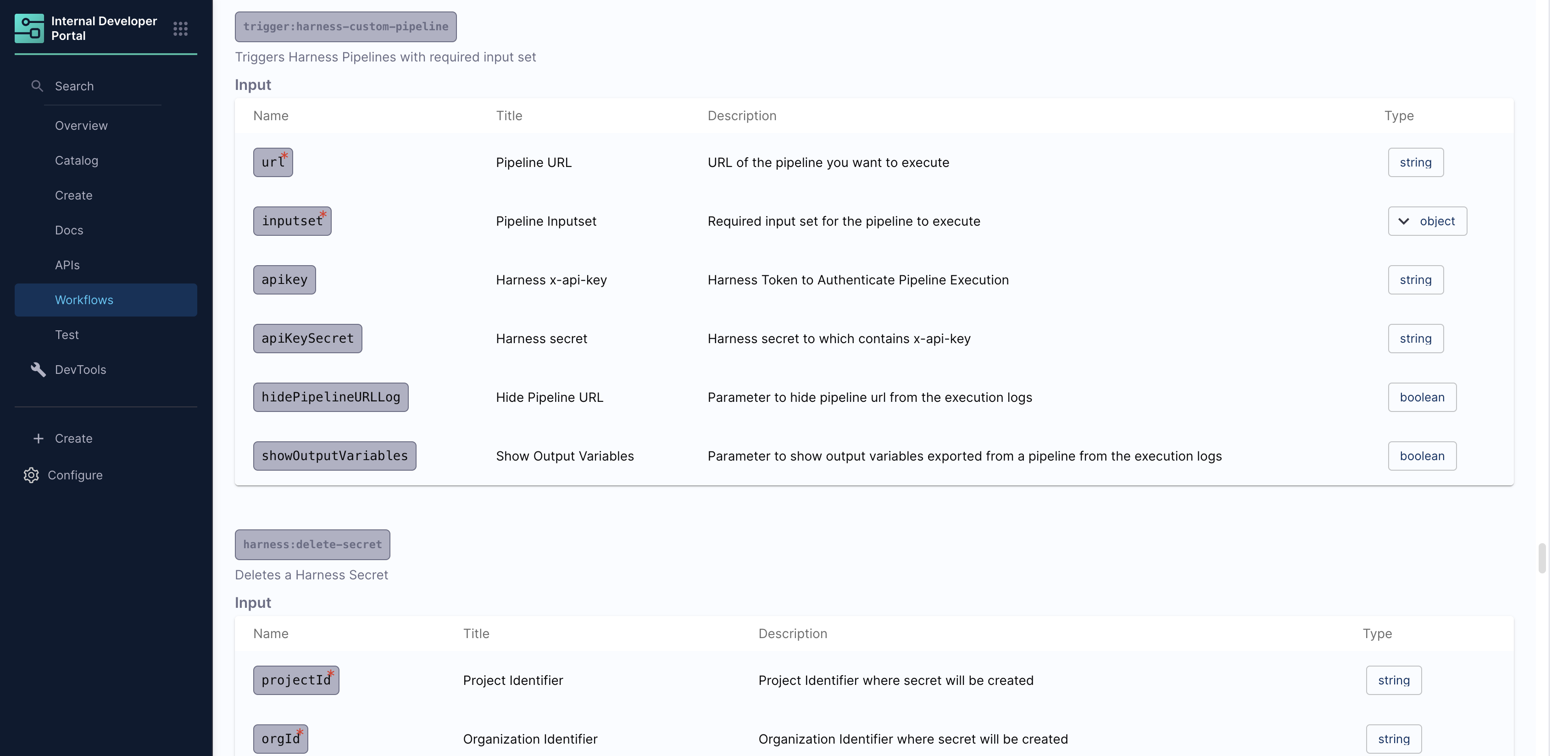 id– A unique identifier for the step, used to reference it in later steps.name– A human-readable label for the step.action– Specifies the workflow action to execute (e.g., trigger:harness-custom-pipeline, publish:github).input– Defines the parameters required by the action. These vary depending on the action used.