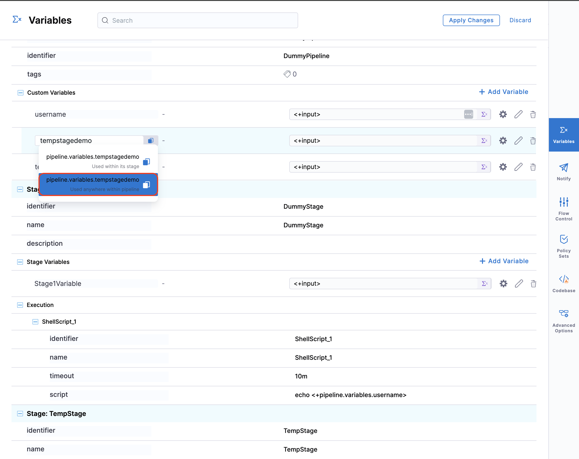 Variable name with Fully Qualified Path (pipeline.variables.variable_name) | Supported with Pipelines Variables for all supported stages and Pipelines containing any templates. |