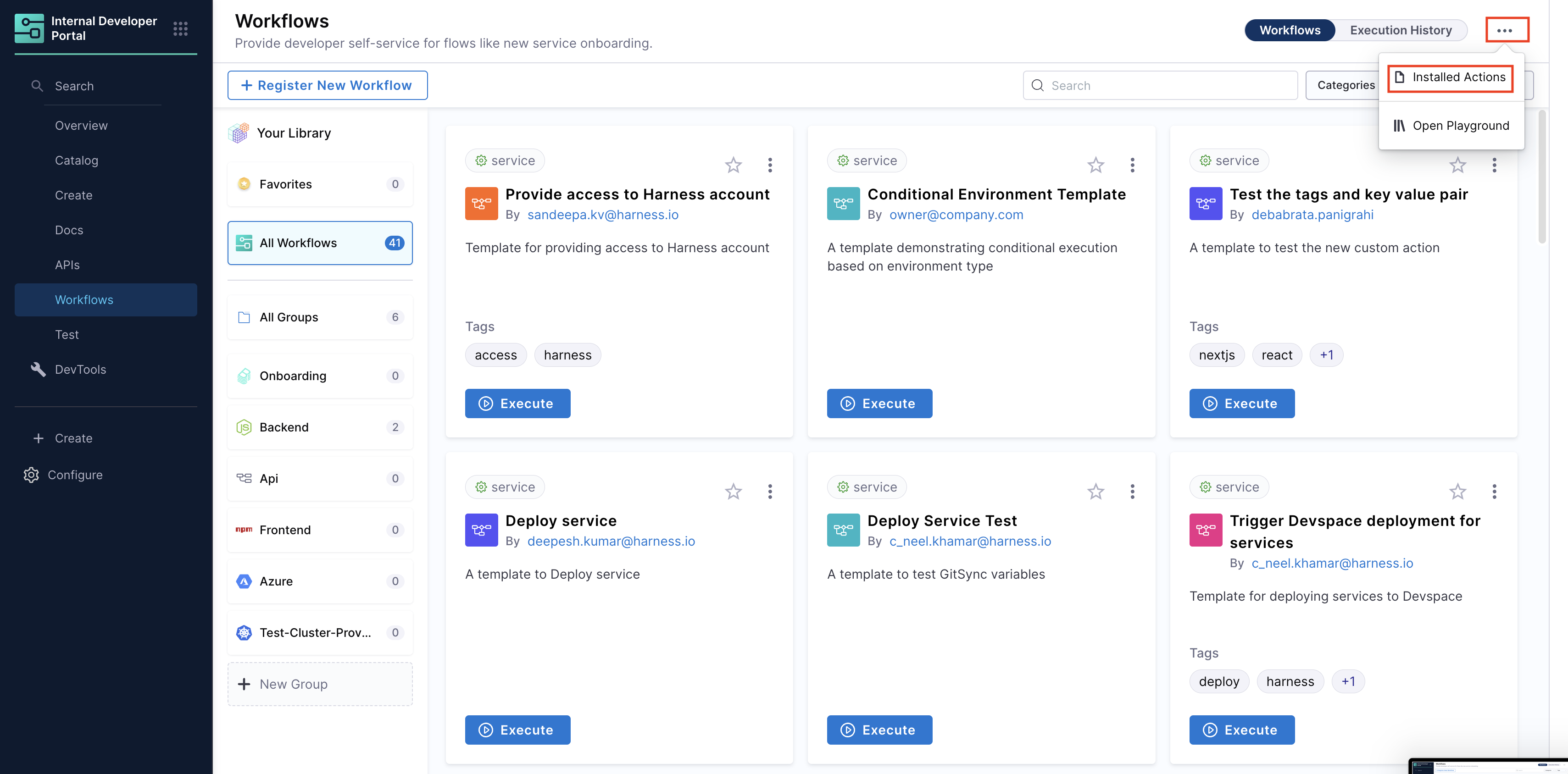 - Click on the three dots in the top right corner of the Workflows page. Select Installed Actions.
