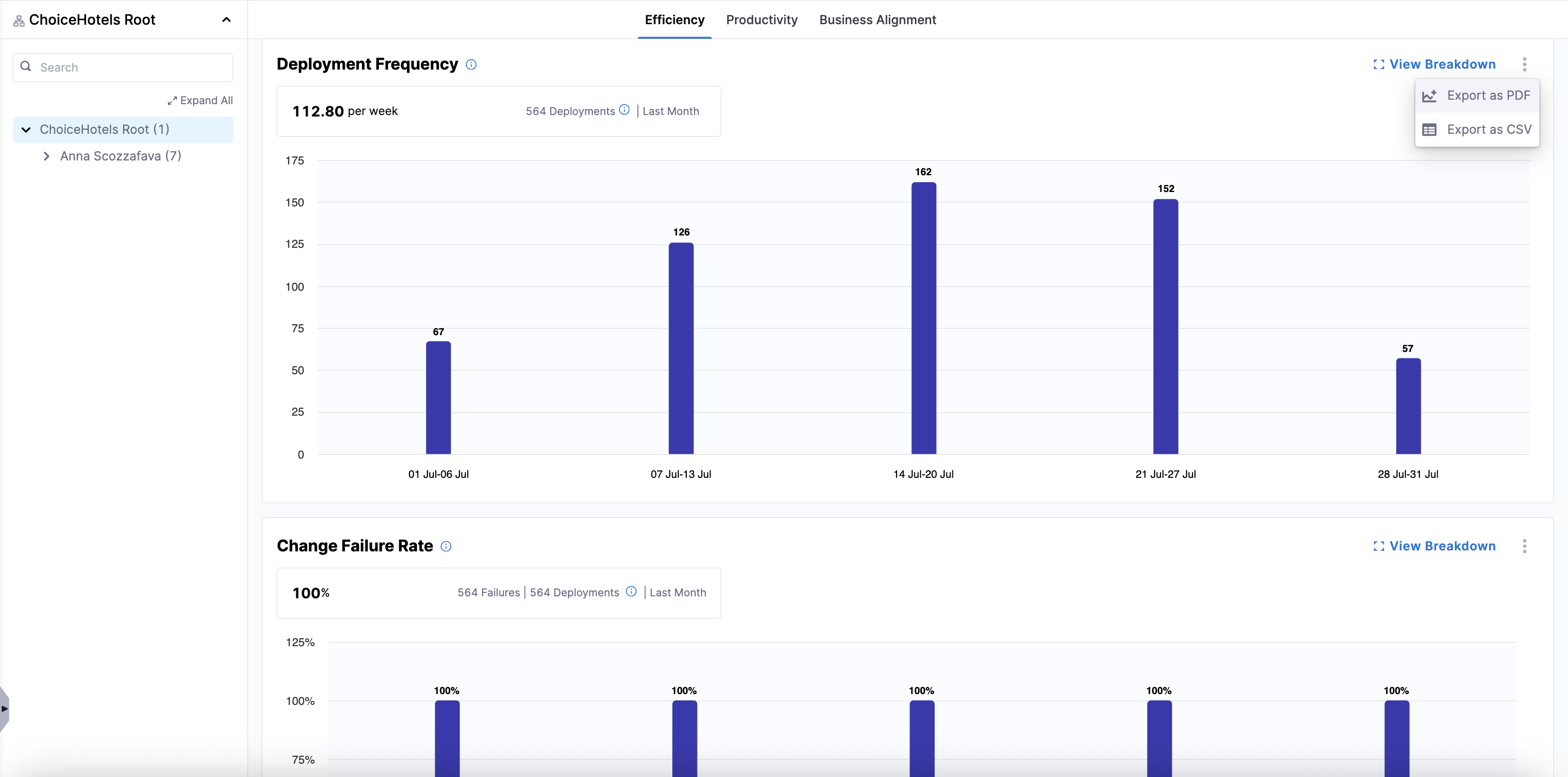 - CSV Export: Offers a detailed data export, capturing metrics at various levels of the organizational hierarchy. This format is suitable for further data analysis and integration with other tools.