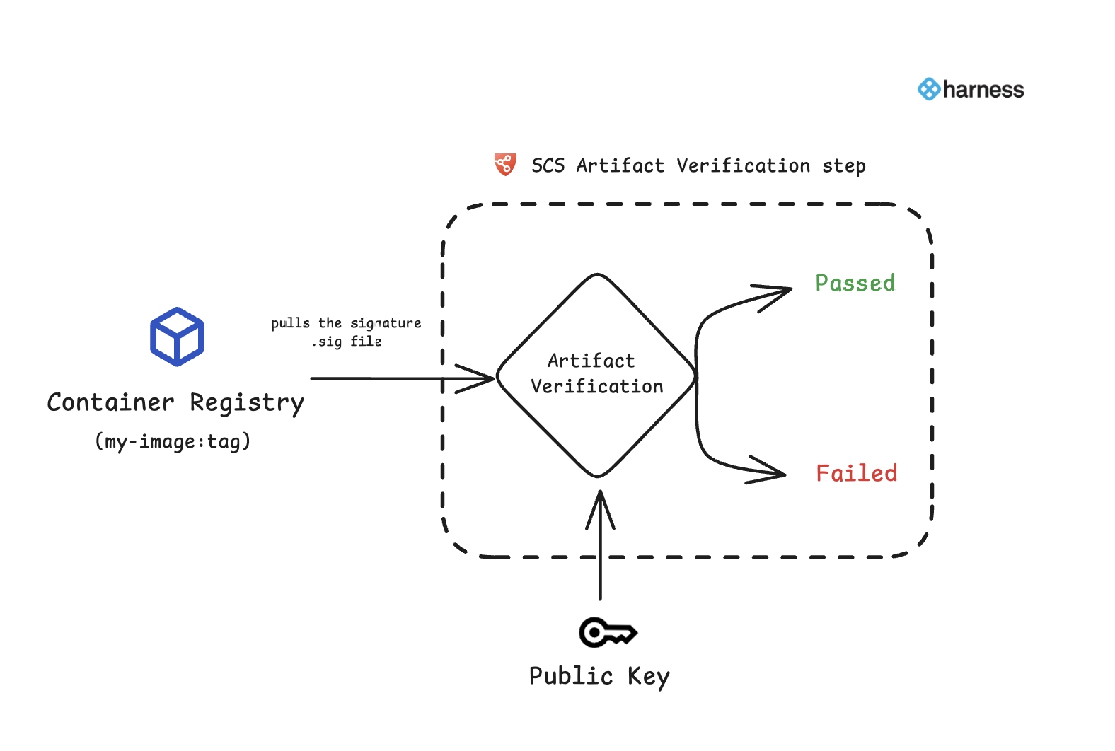 The Artifact Verification step pulls the .sig file from the artifact registry and verifies it with the corresponding public key. In the artifact signing step, if you have chosen not to push the .sig file to the registry, then for the artifact verification .sig file will instead be pulled from the Harness database. This process ensures that the artifact was signed by a trusted entity, thereby confirming its integrity and authenticity.
