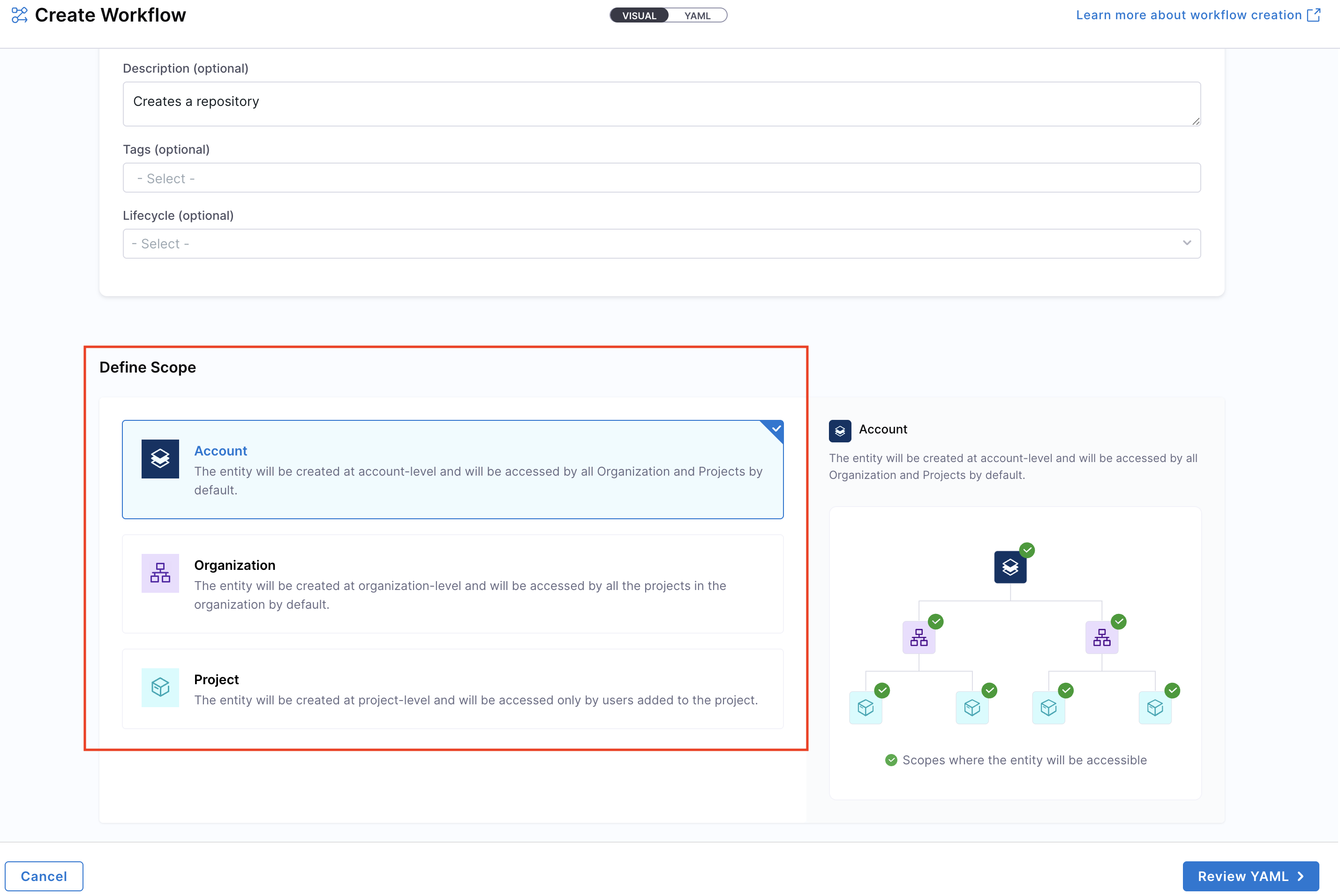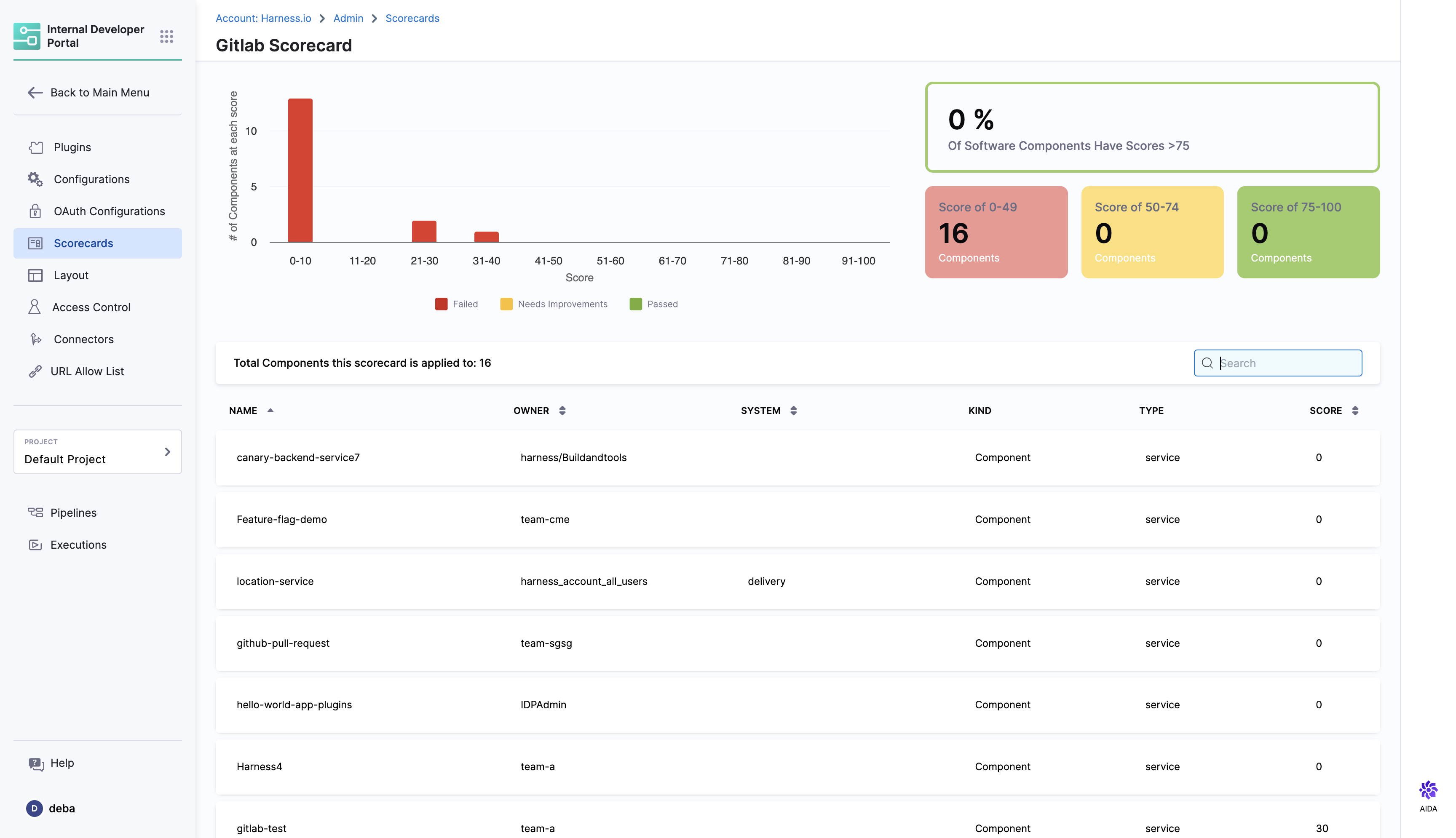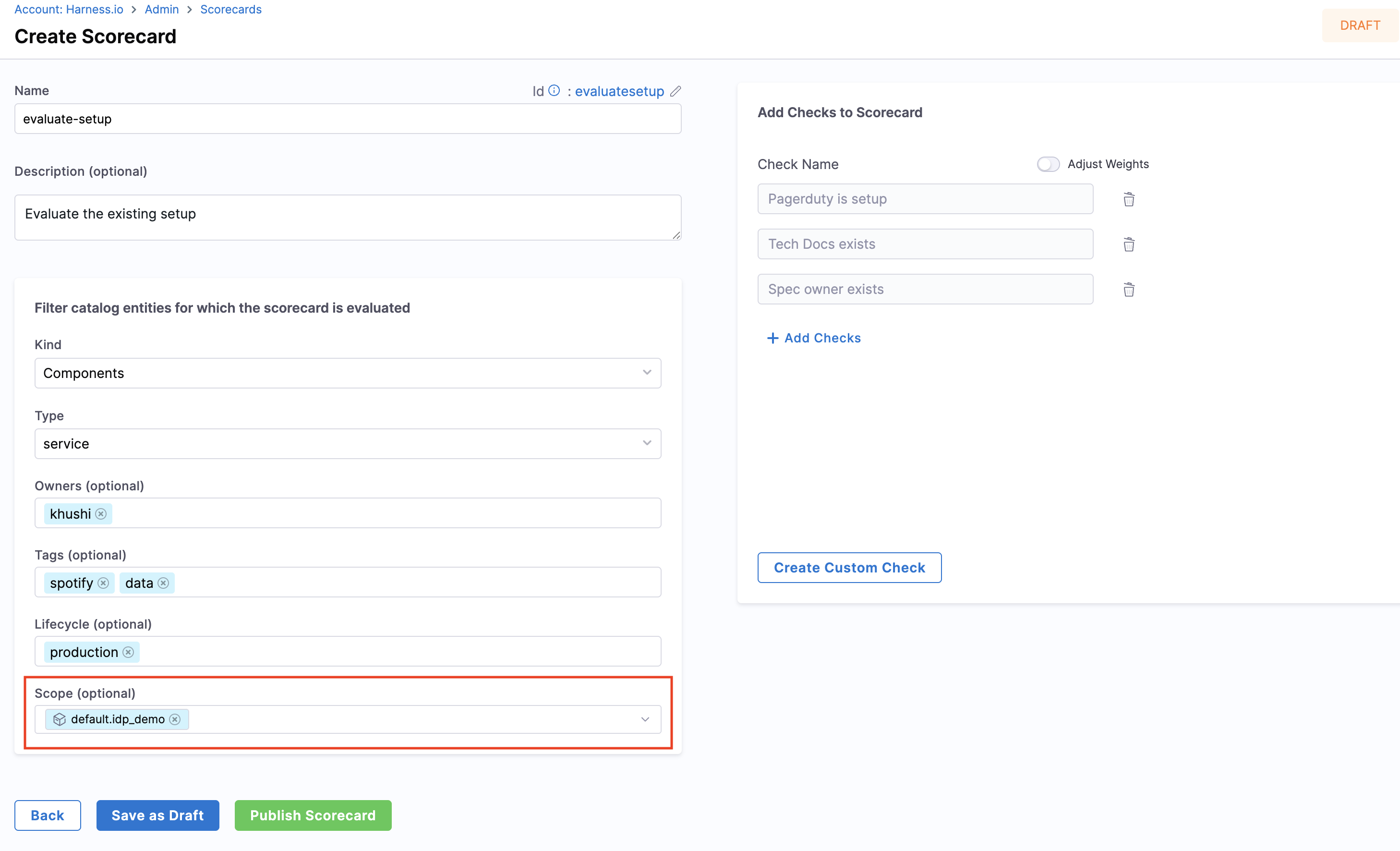• If no scope is selected, the scorecard evaluates entities across all scopes (account, org, and project).