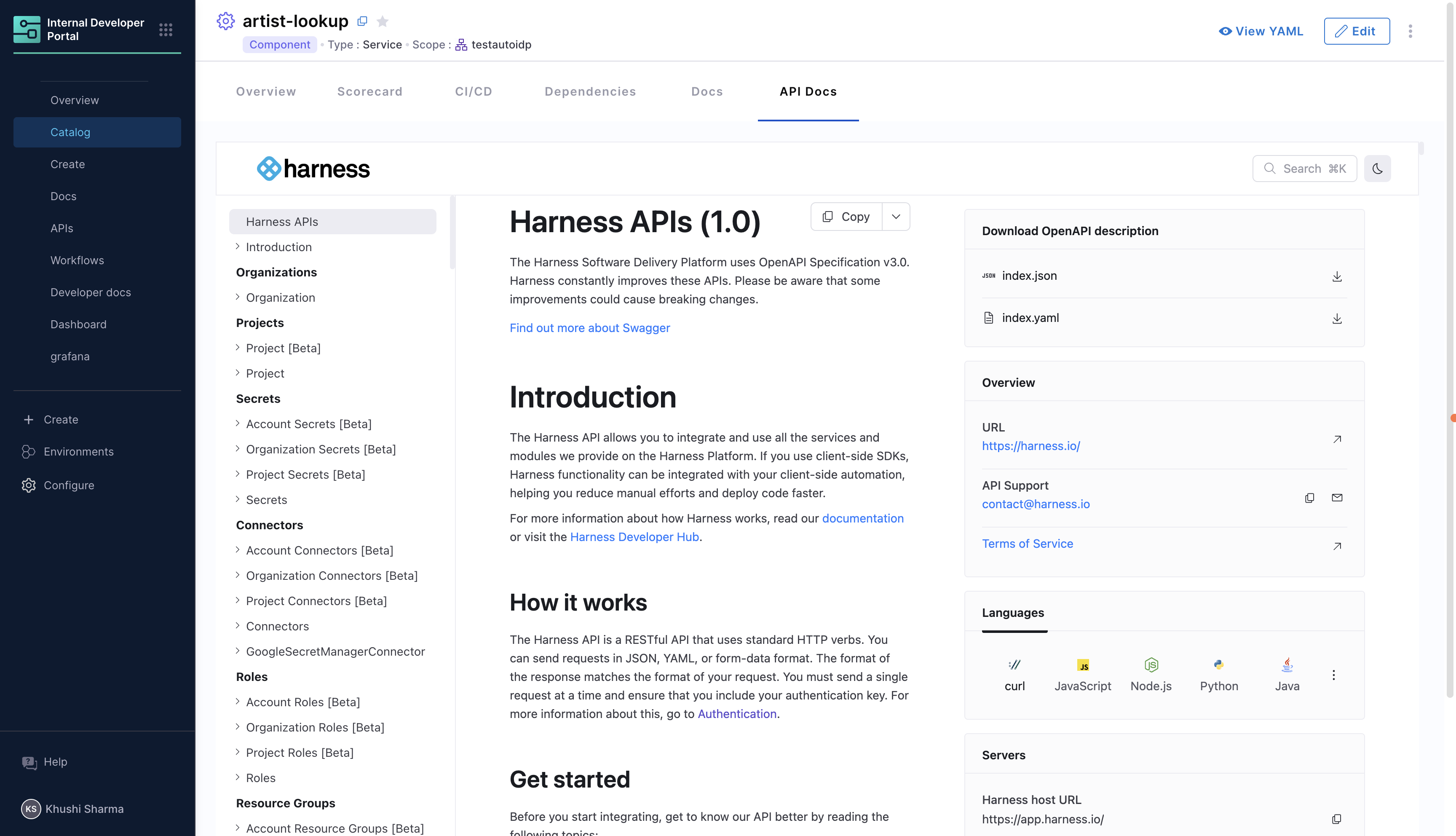 • You can now access IDP catalog APIs by using the Harness X-API-Key. For more information, go to API access. (IDP-768)